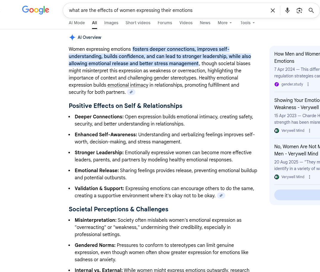 The other is that while the AI summary admits that an emotional style that prioritises empathy and expressiveness at all costs has its drawbacks, it admits to those drawbacks in the usual backhanded fashion. If ever-more intense emotional disclosure is bad, that’s because it’s “too perfect”; empaths are too wonderful, too admirable, and get pigeonholed as the people who can feel everything for everyone. This perception of male/ female emotional styles falls into a pattern we see when analysing political inclinations. Right-wing/ conservative/ restrictionist or just not maximally liberal approaches are bad because they’re wrong and nasty, whereas when maximally liberal/ progressive approaches are bad because they are applied insufficiently, or are too enlightened and kind for their own good, and place too heavy an emotional burden on the people who advance them. These are the kind of results you get when you mark your own homework.