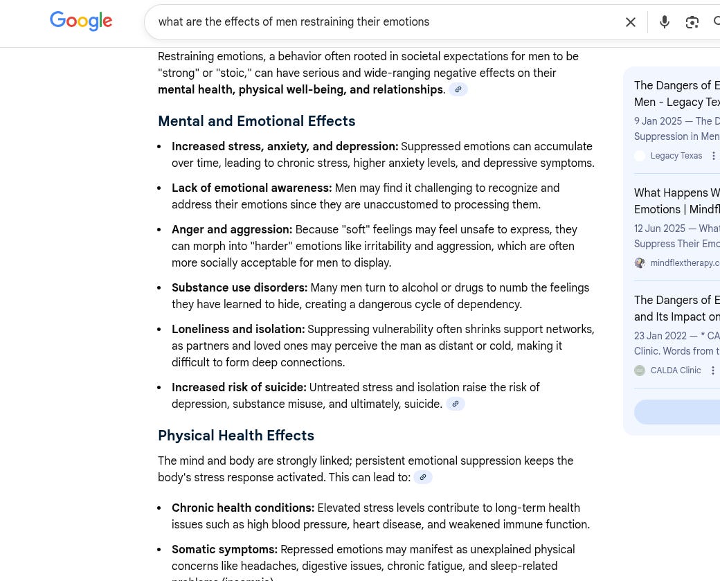 Reading that puts me in mind of the scene in Malcolm X where Denzel Washington reads the dictionary definitions of black and white. Amongst men, emotional restraint is “…a behavior often rooted in societal expectations for men to be “strong” or “stoic,” (that) can have serious and wide-ranging negative effects on their mental health, physical well-being, and relationships…” whereas on the other hand “… women expressing emotions fosters deeper connections, improves self-understanding, builds confidence, and can lead to stronger leadership, while also allowing emotional release and better stress management.”