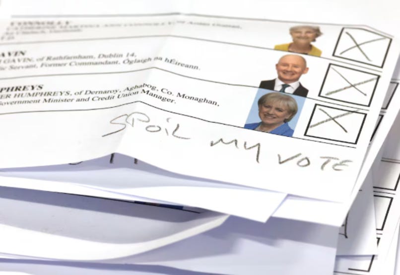 Ireland just had a Presidential election in which a record number of spoiled votes were cast; approximately 200,000 - 12% of the total votes cast, around ten times the rate of the last contest. This fantastic analysis by Kevin Cunningham has shown that these voters are mostly not left-wing and were therefore never likely to vote for Catherine Connolly, the candidate of the unified left, who won in a landslide. The spoiled votes have been seen as an explicit rejection by centre and right-leaning voters of Fianna Fáil and Fine Gael, the two largest legacy parties. This election was a humiliation for them and represents a continuation of their gradual spiral into death or insignificance.