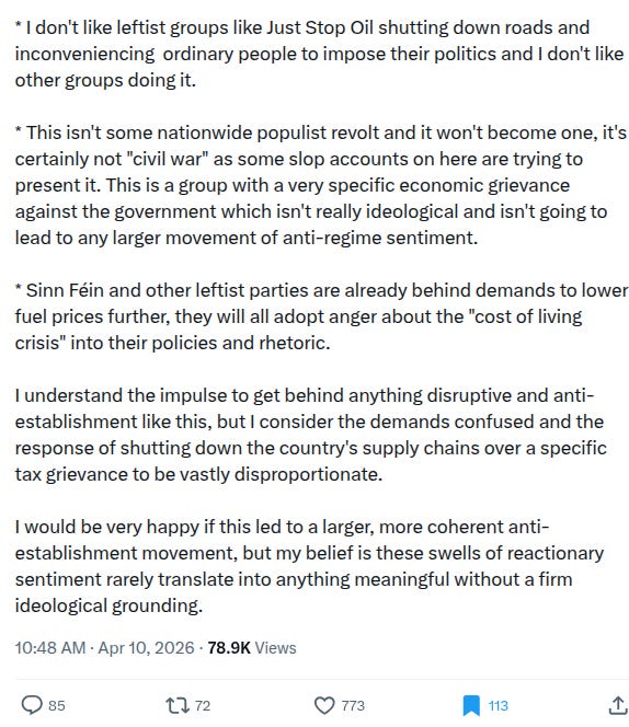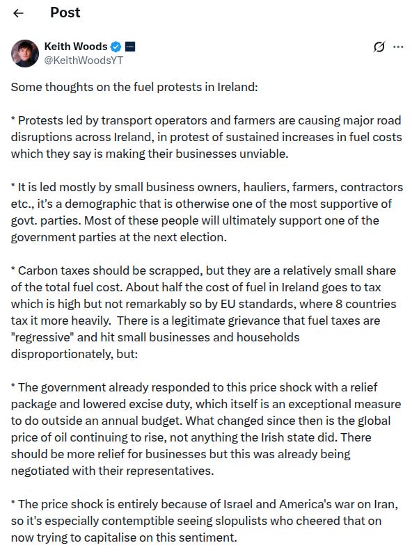 I don’t agree with each point here, and don’t know how accurate his assessment of the support provided to date is. But he’s absolutely correct that the people conducting this protest were Fianna Fáil/ Fine Gael or crypto FF/FG Independent voters and not revolutionaires with a deeper grudge towards the system and how it operates. They are members of a consensus- and propriety-conscious, risk-averse middle that forms the Cordon Saintaire around culture war issues. Keith is absolutely correct that ideas about cost of living, taxation and the distribution of public goods are important and can be threatening to individual politicians, but they form the safe space of Irish politics, the ground everyone is most comfortable on. Despite the efforts of people on all sides to capitalise on the decentralised nature of the protests to make it about their own hobby horse, there was no secret ideological core to the protests that could serve as the start of a larger philosophical change for the country.