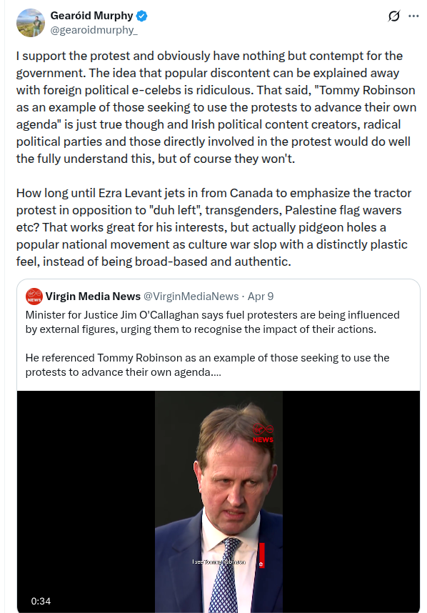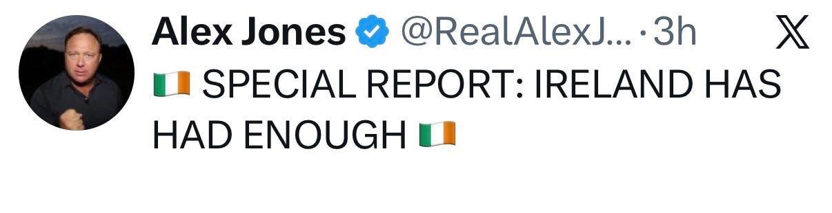 Robinson is a self-described Loyalist, and both he and Levant are stauch and vocal supporters of Israel. It would be impossible to cook two people up in a lab better designed to repulse the average Irish voter. They themselves must surely be aware of this, so the question is why even comment? People on the Irish right sometimes speculate this is a psyop designed to discredit them; I think the truth is both sadder and more sinister. For people like this “Ireland” doesn’t exist, except as a kind of token to be traded amongst players in a larger political game, to help their audiences feel either better or worse about what’s going on in their own countries, for their own reasons. That’s facilitated by Irish content creators who prosper by speaking in the language of, and appealing to the prejudices of, an international (mostly but not exclusively american) audience, and purposely misleading them about the nature of the situation here. Much of the “Ireland is rising” type content that circulated as the protest took hold were shots of unrelated and quite different immigration riots and protests from a few months ago. As Gearóid correctly notes, all this is an active impediment to the development of any kind of challenge to cultural consensus within Ireland.